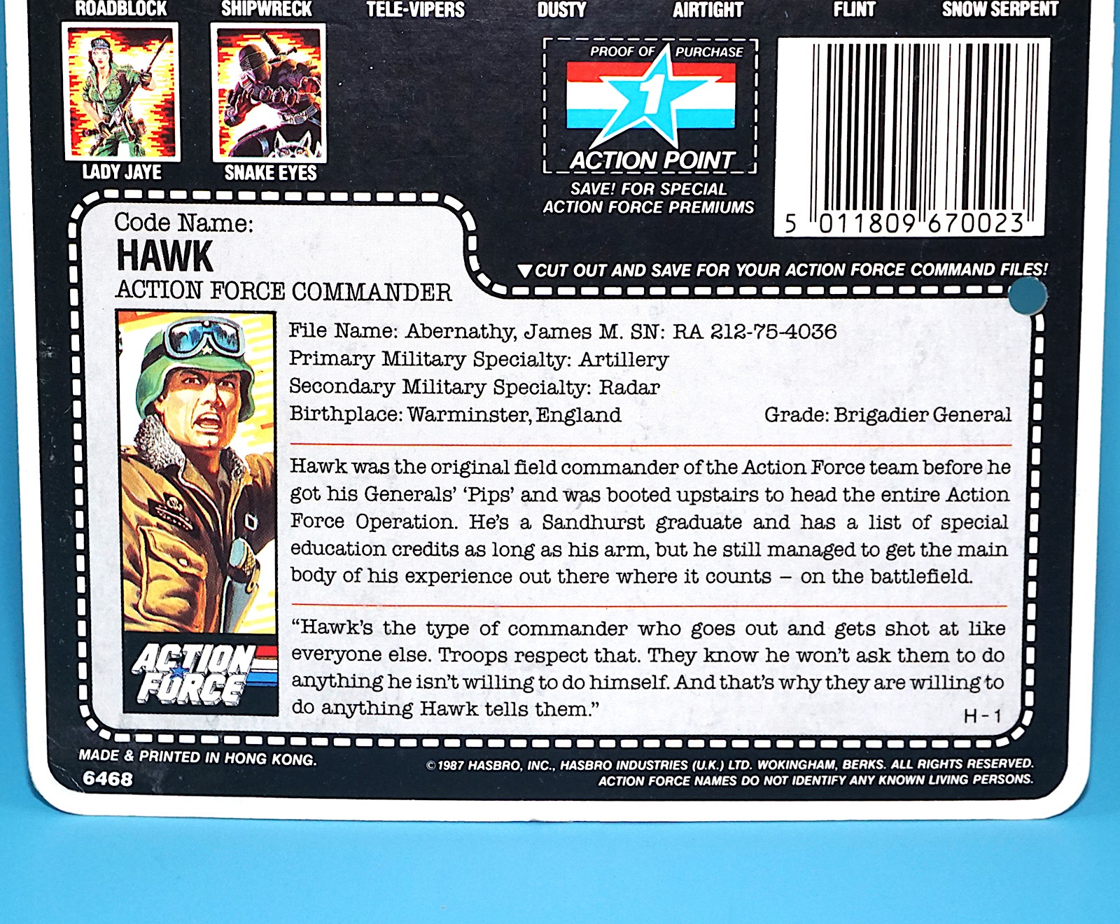 1986 GI JOE HAWK v2 CARDBACK UNCUT FILE CARD FILECARD ACTION FORCE UK 1987 HASBRO