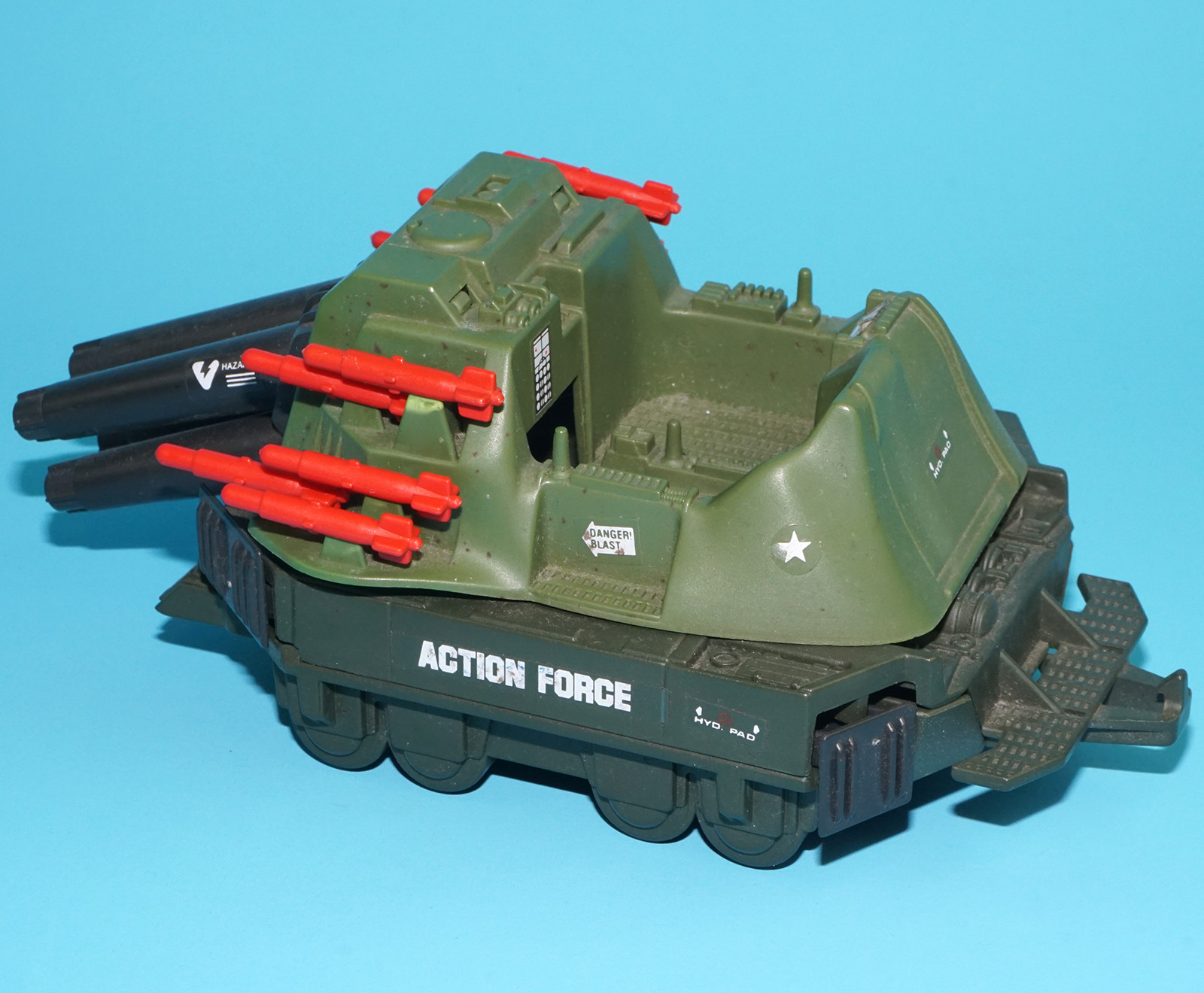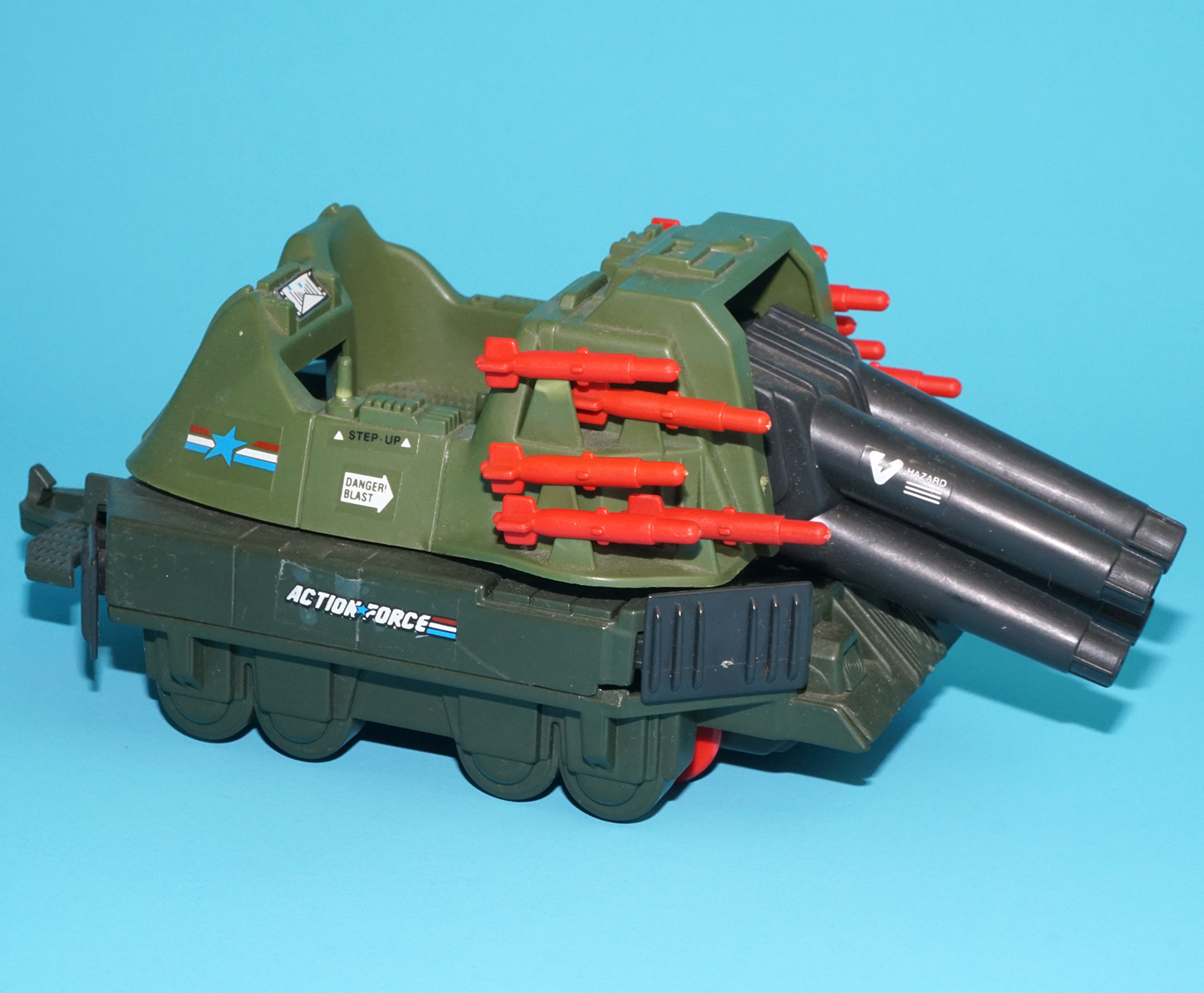 Gun barrel does not stay up. Stressmark on one missile clip; see close up for details.