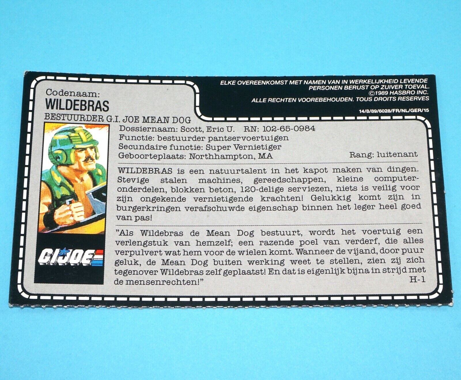 1988 GI JOE WILD CARD v1 MEAN DOG DRIVER UNCUT FILE CARD FILECARD NL DUTCH EURO HASBRO