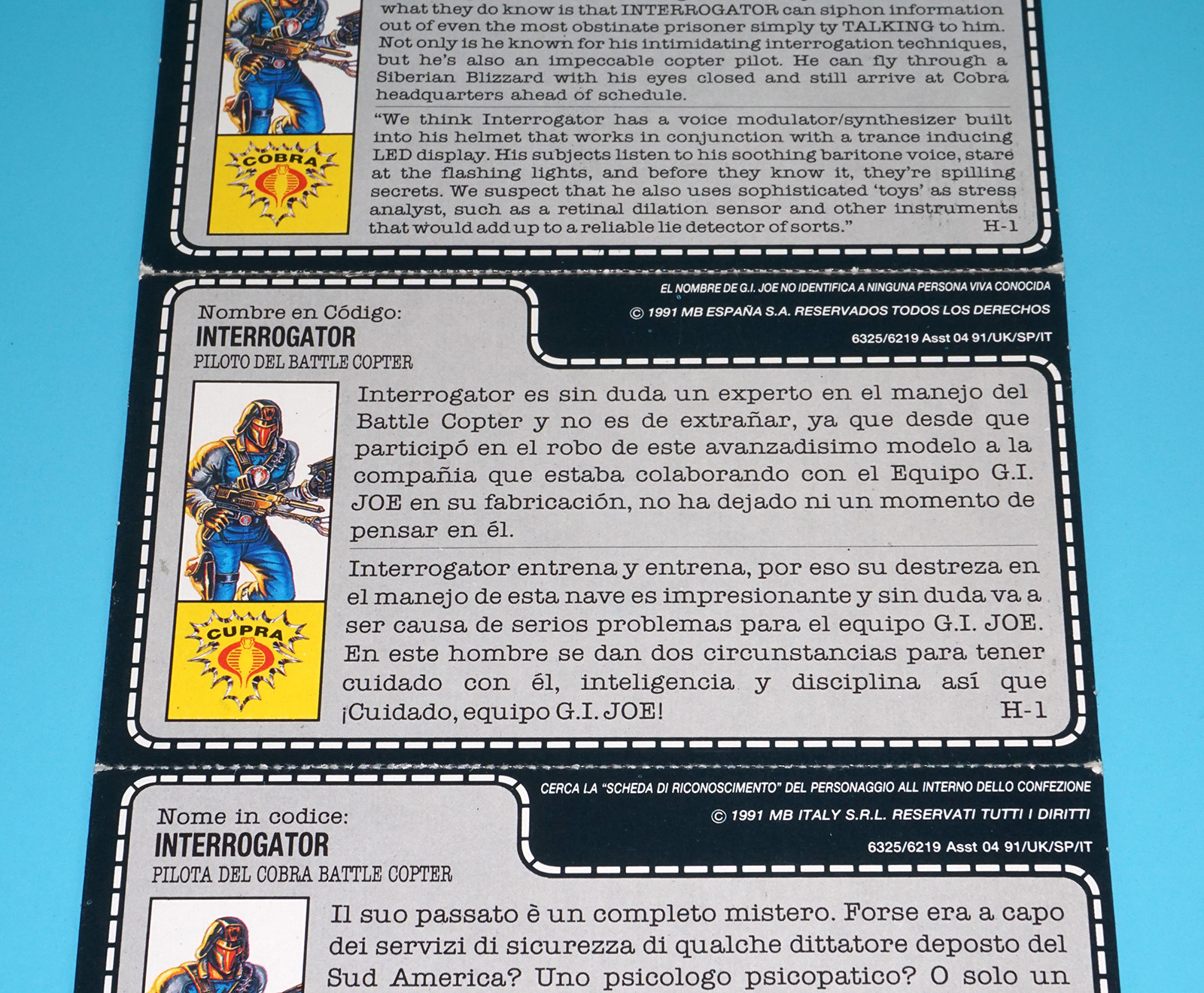 1991 GI JOE BATTLE COPTERS INTERROGATOR v1 UNCUT FILE CARD UK ES IT EURO HASBRO