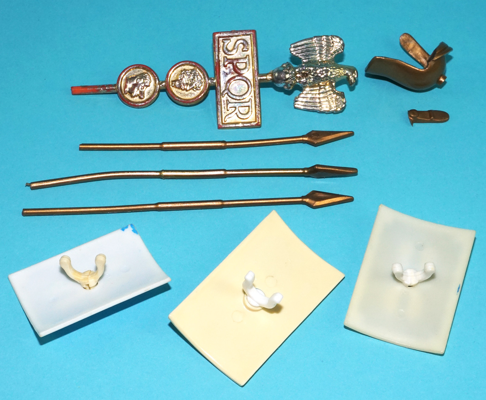 Near complete! Missing tent corner bobbins. Broken tent roof pegs, wall clips, helmet, SPQR staff and spear. See pictures for details.