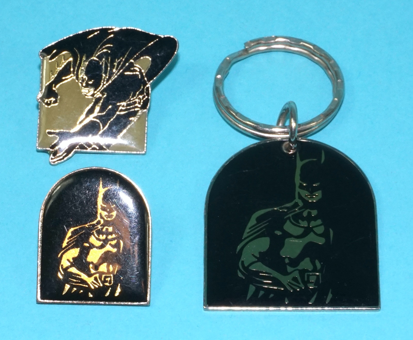 BATMAN DARK KNIGHT KEYRING KEYCHAIN ENAMEL LAPEL PIN LOT (3X) 1988 MISTER BADGE DC COMICS
