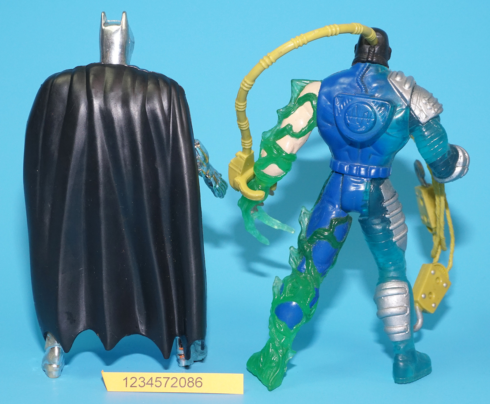 Missing batarang handle part. Batman has some chrome wear. See pictures for details.