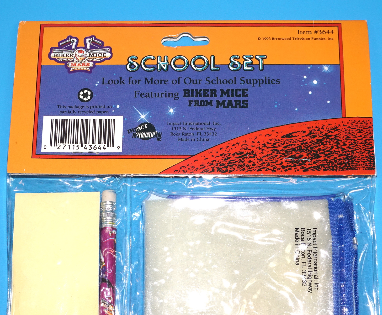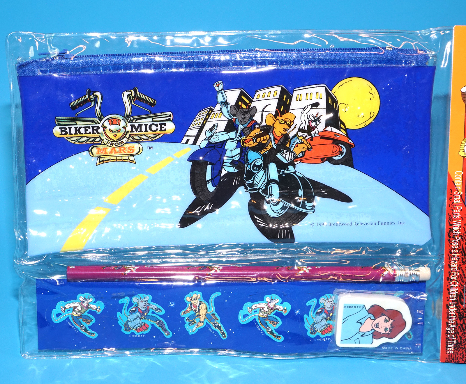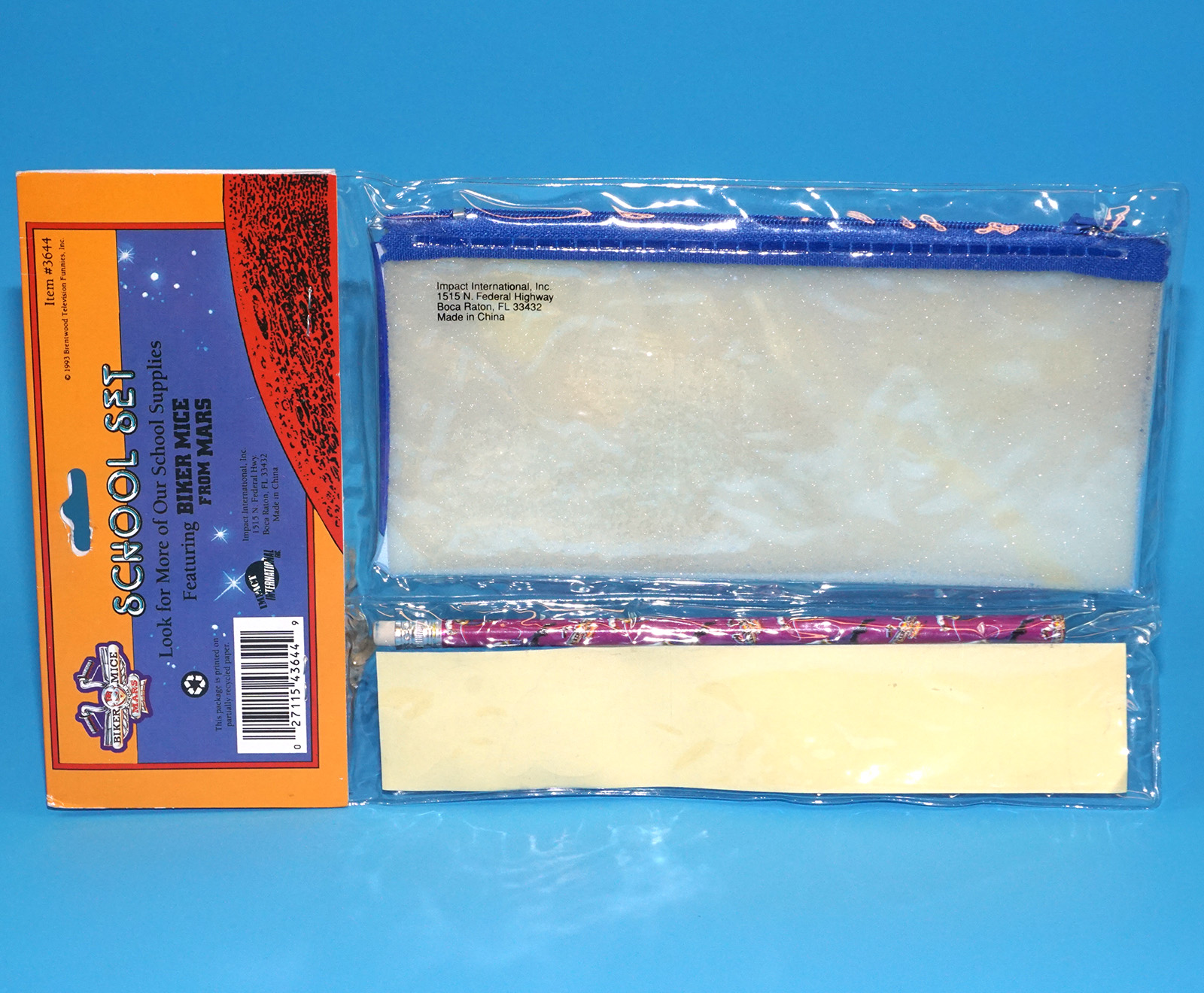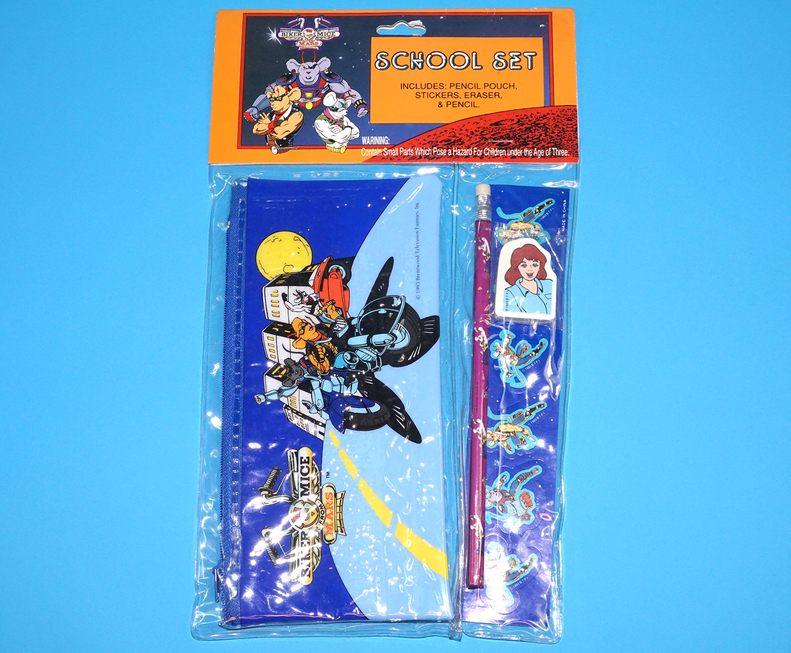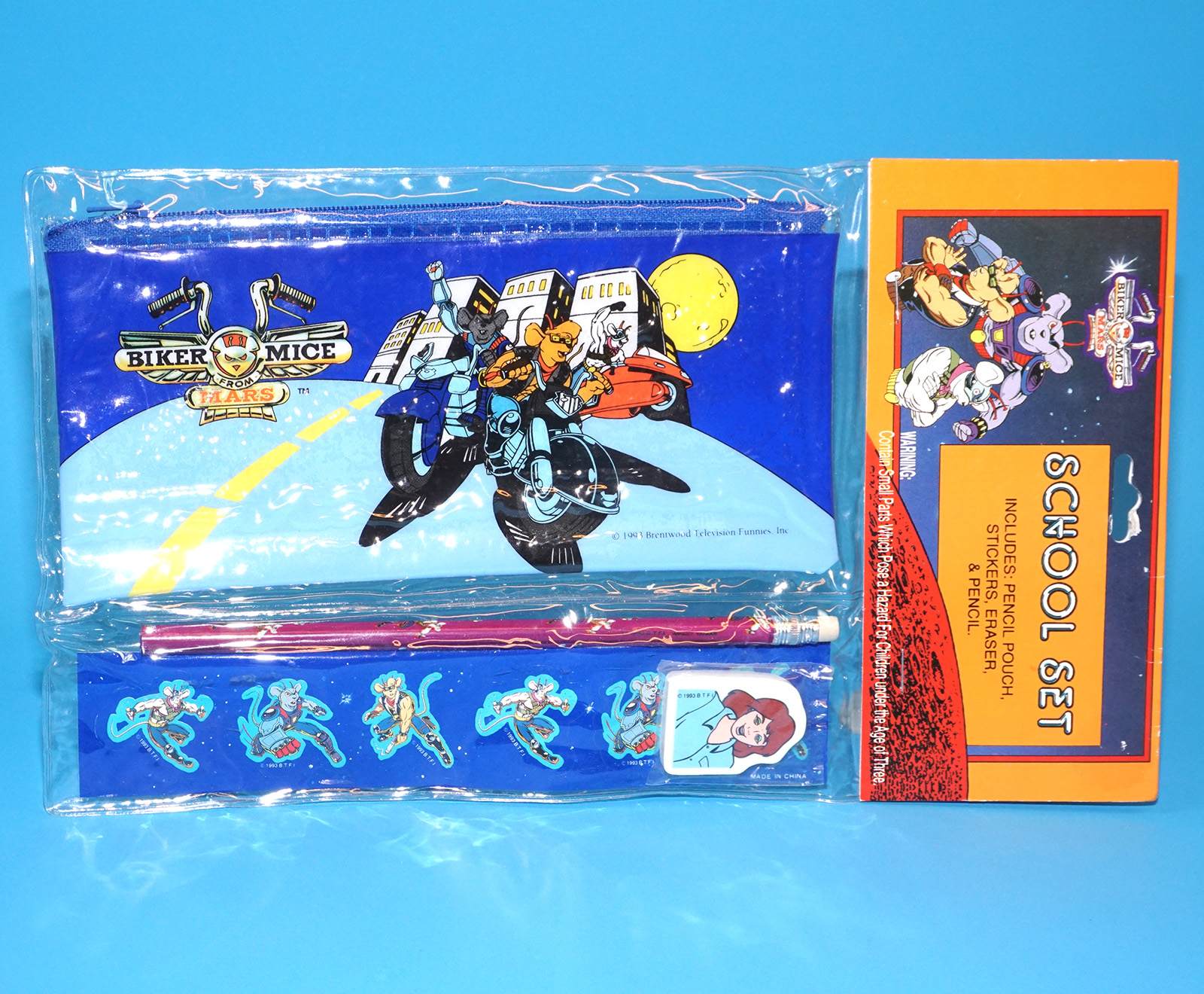BIKER MICE FROM MARS SCHOOL SET PENCIL POUCH STICKERS ERASER MOC MOSC SEALED PACK 1993 IMPACT INTERNATIONAL INC.