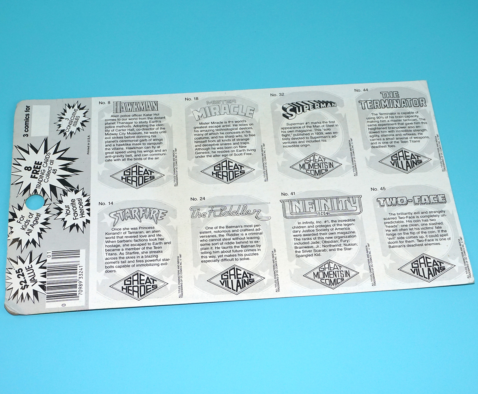DC COMICS GREAT HEROES / VILLAINS TRADING CARDS UNCUT SHEET 3 COMICS 1987 INDICIA