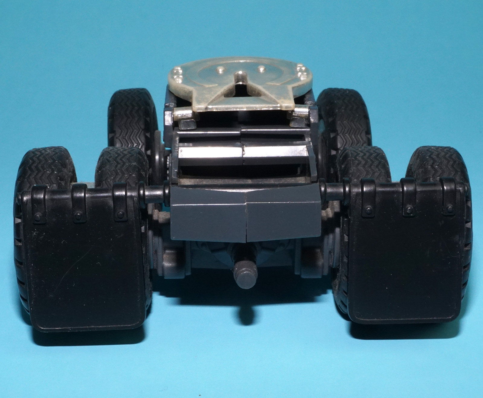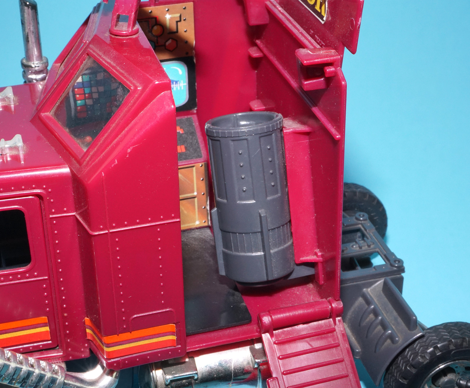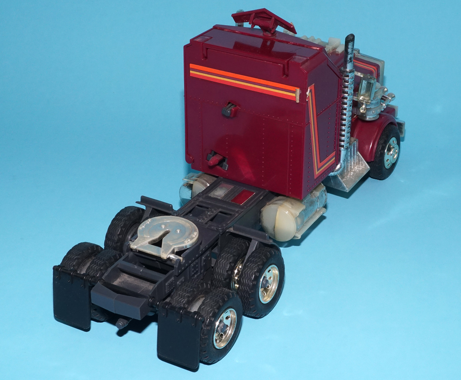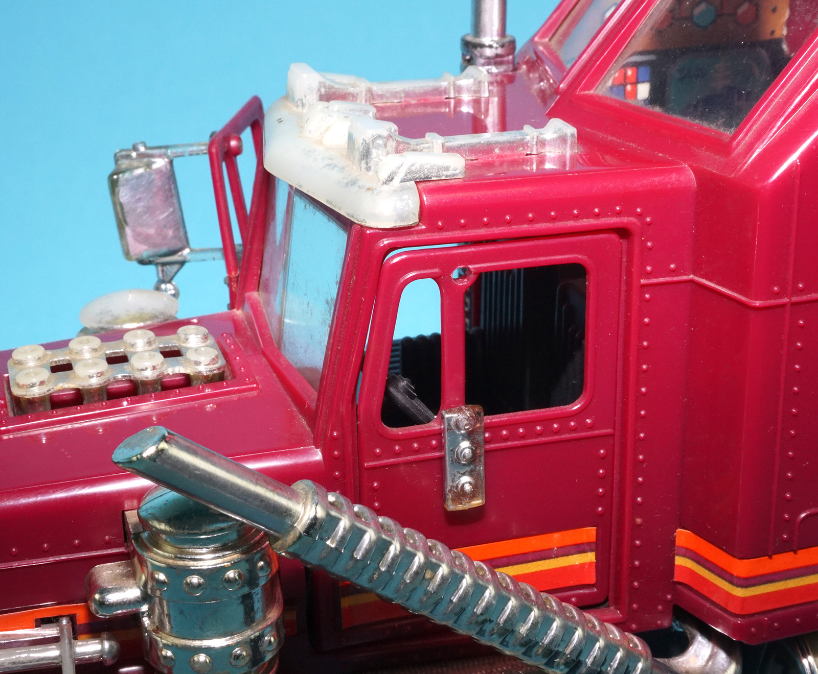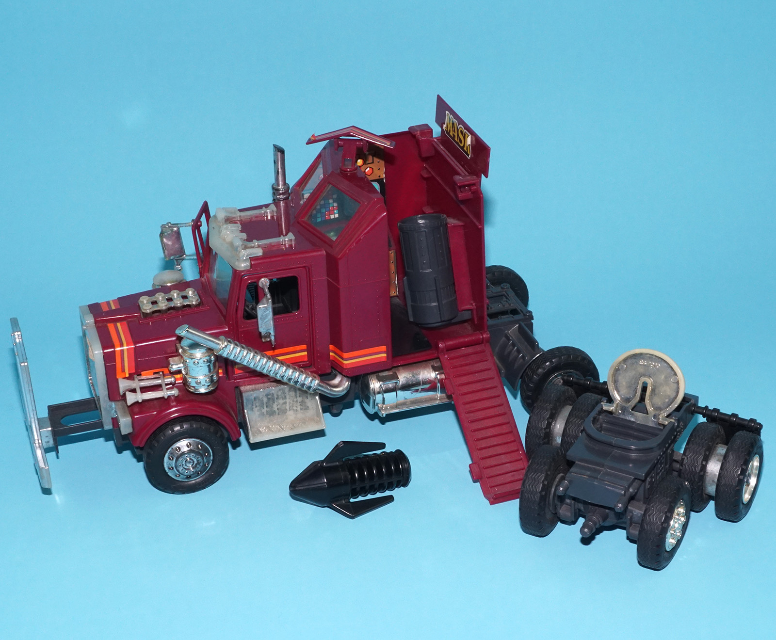 Mechanism works! Black launcher. Smooth mudflaps and headlights. One broken mirror. Fair chrome. See close up for details.