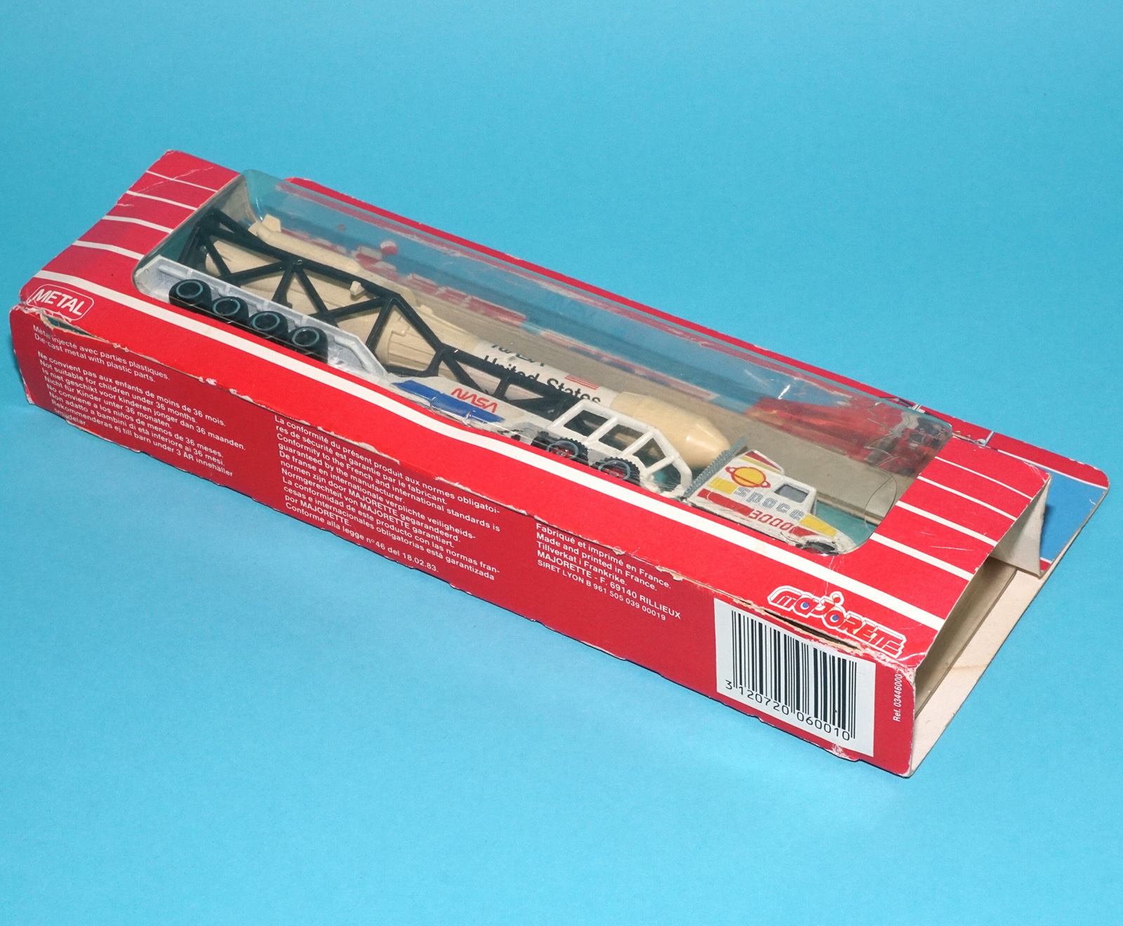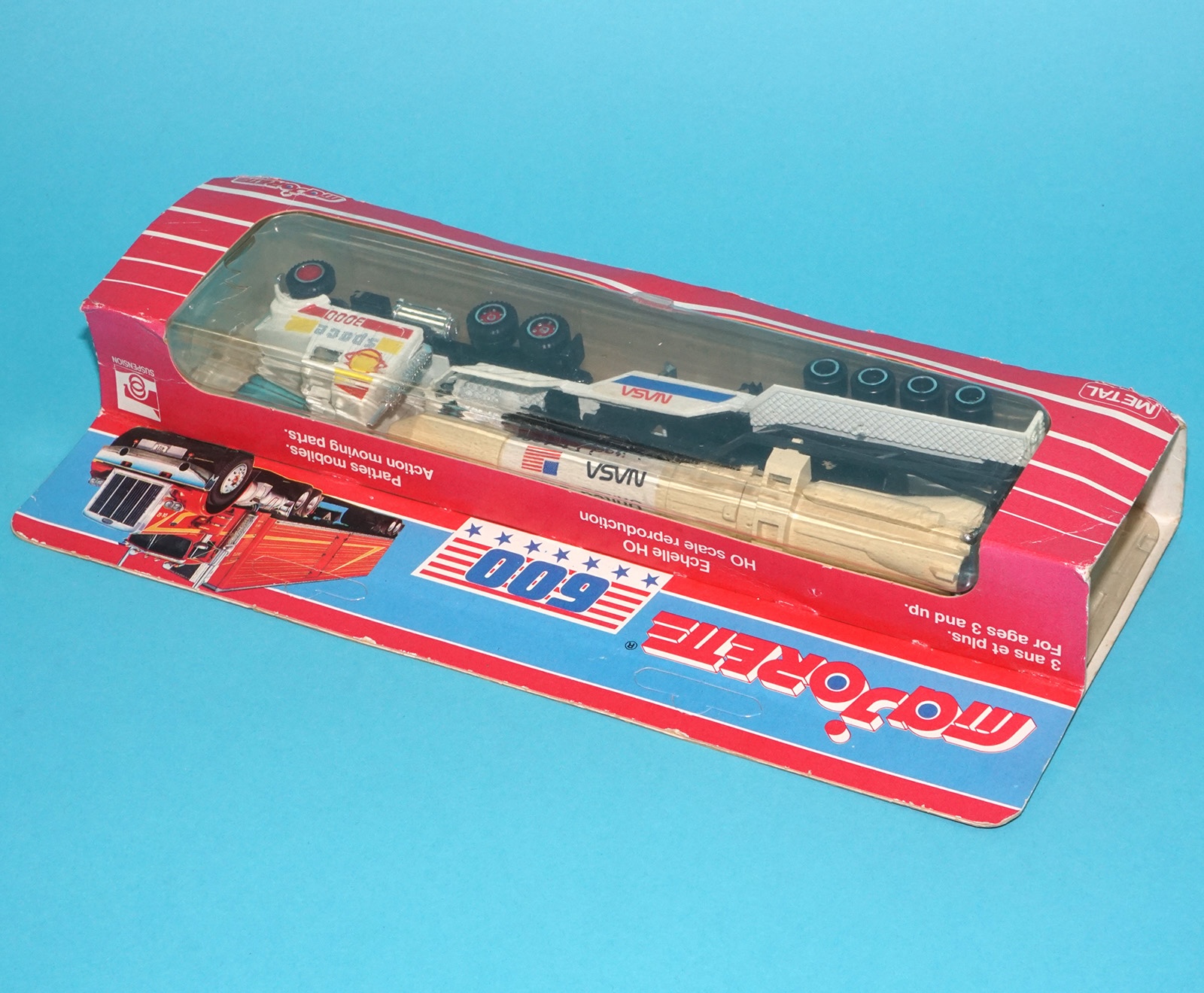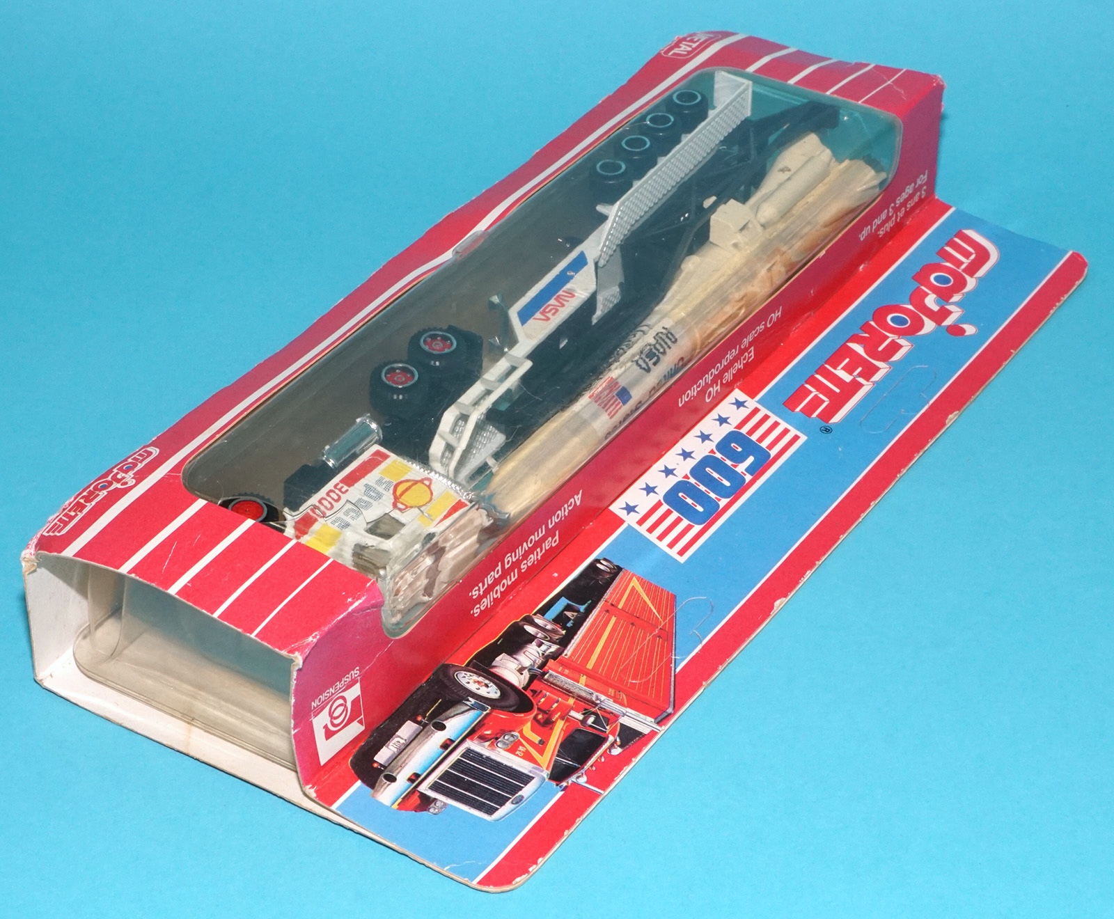 Cracked blister. Space 3000 tractor cab with NASA rocket and trailer. Factory error? Rocket is fairly yellowed.