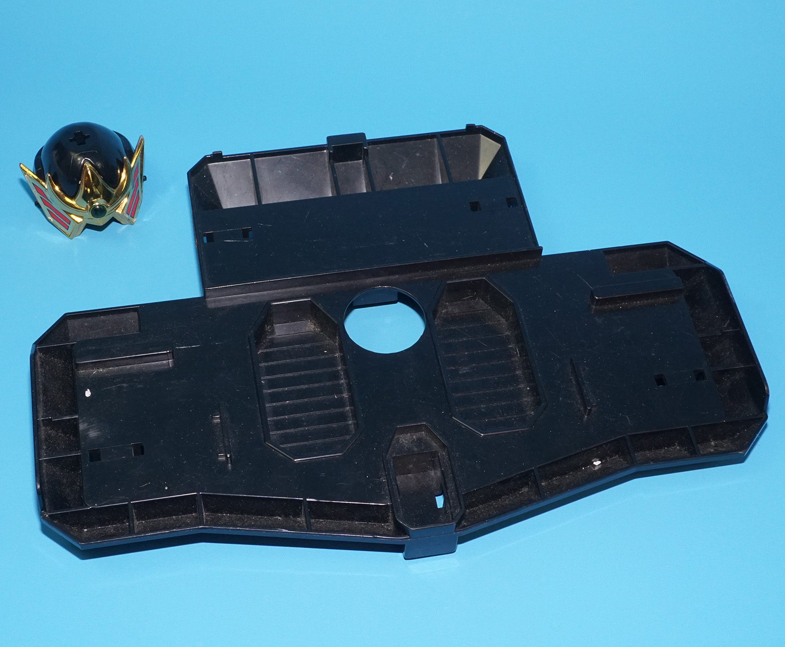Box has seen better days. Missing helmet crest, sword sheath, bo staff part, pterodactyl tail and base handle. Overall very good.