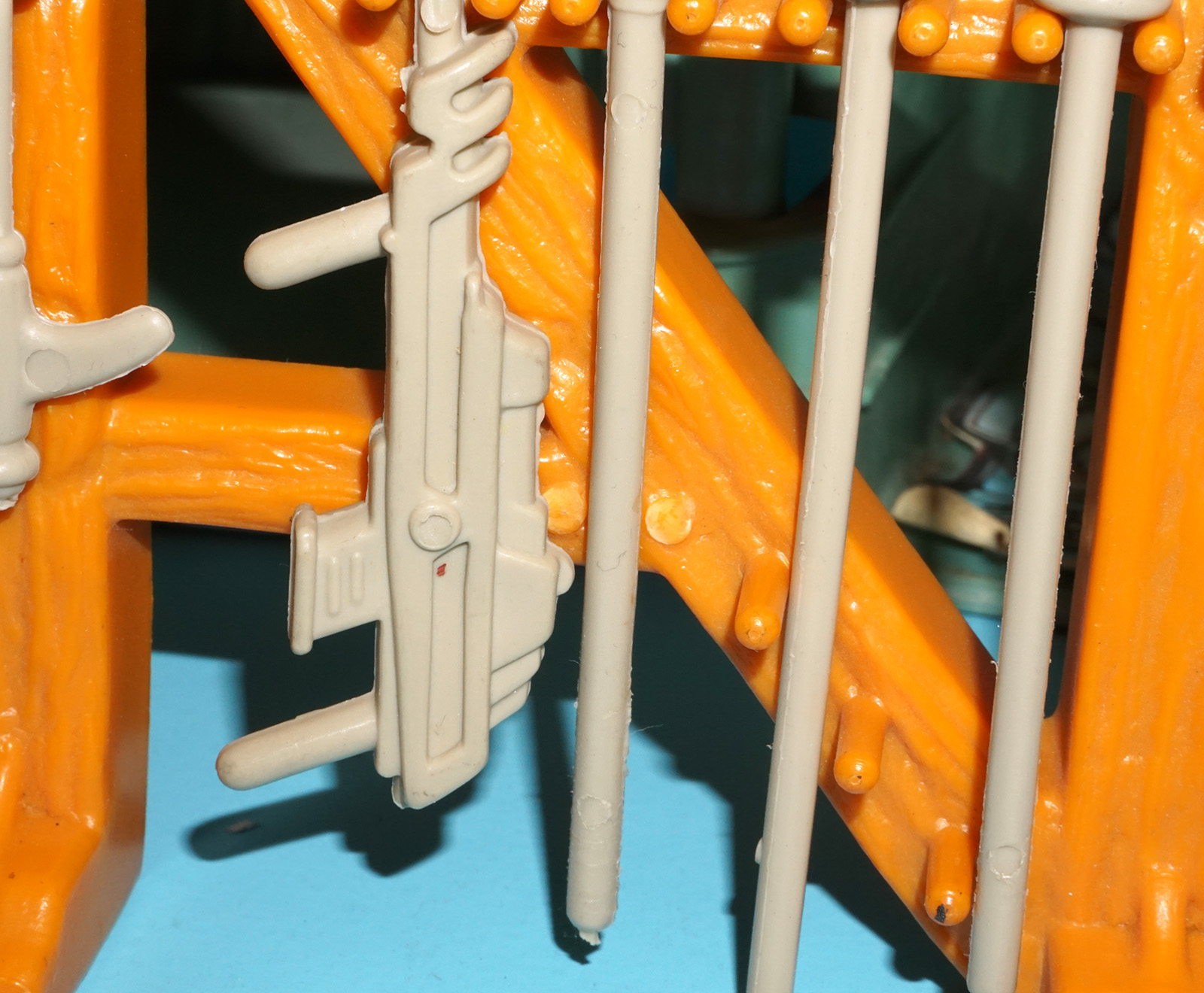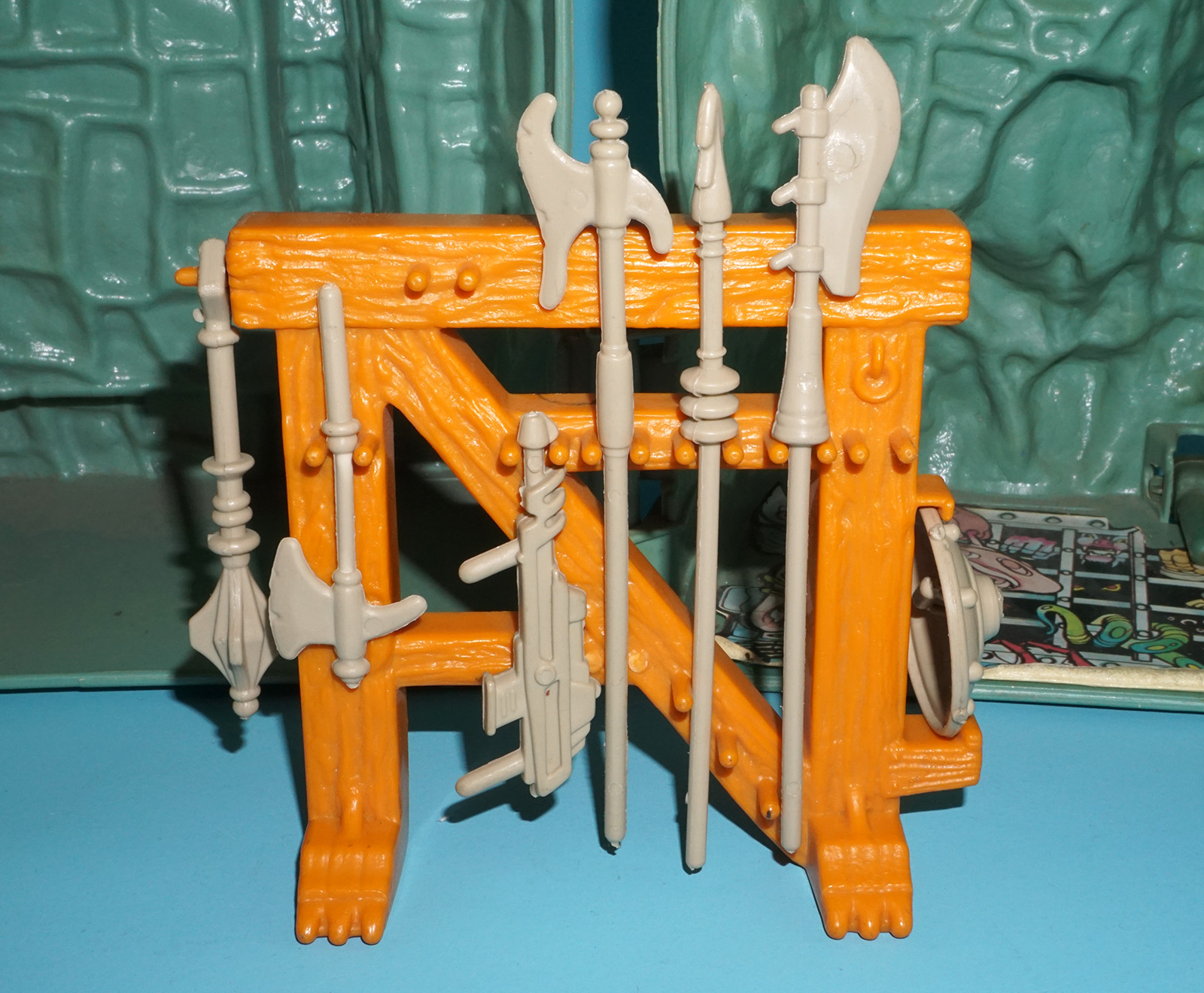 Missing small gun, sword and cardboard inserts. Broken tower floor clips and weapon rack pegs; see close ups. Overall very good!
