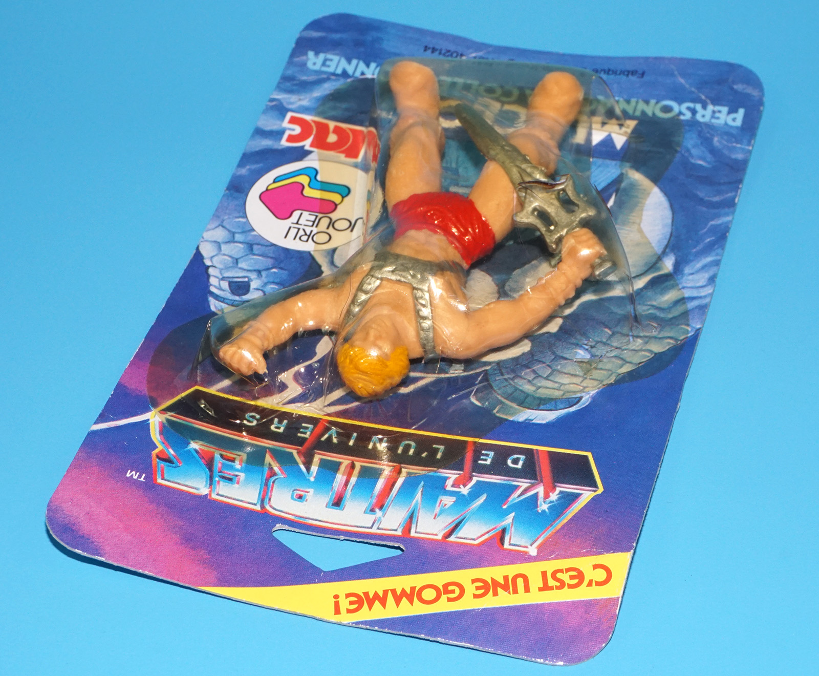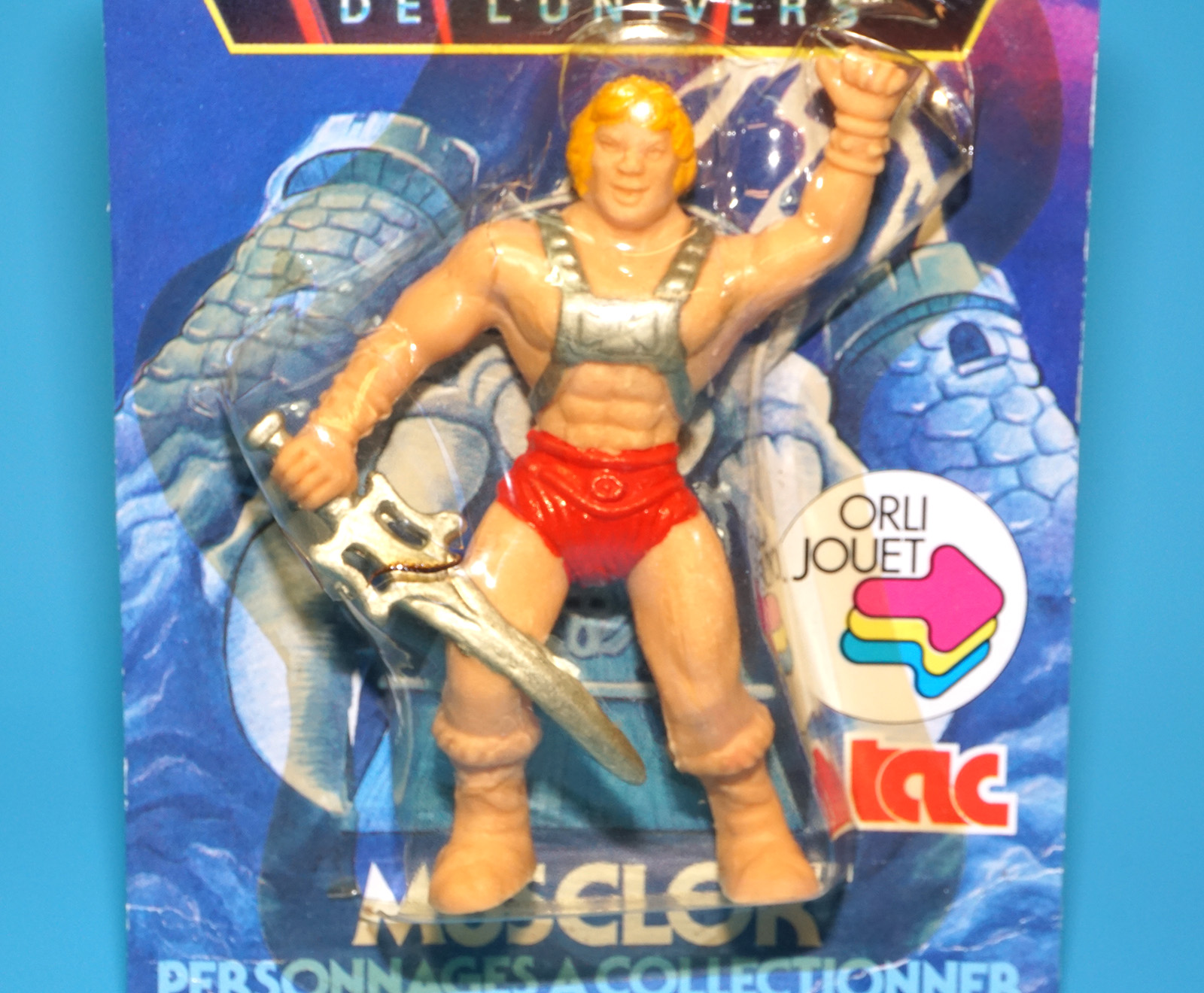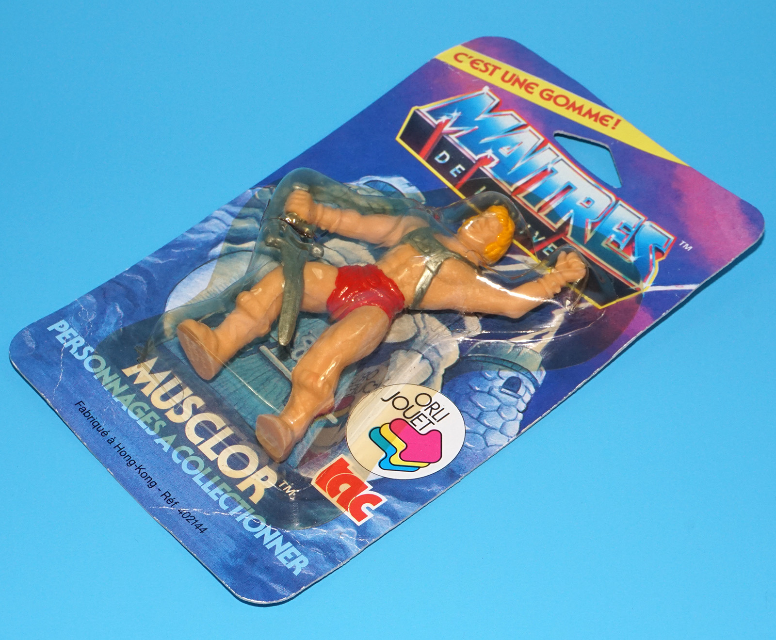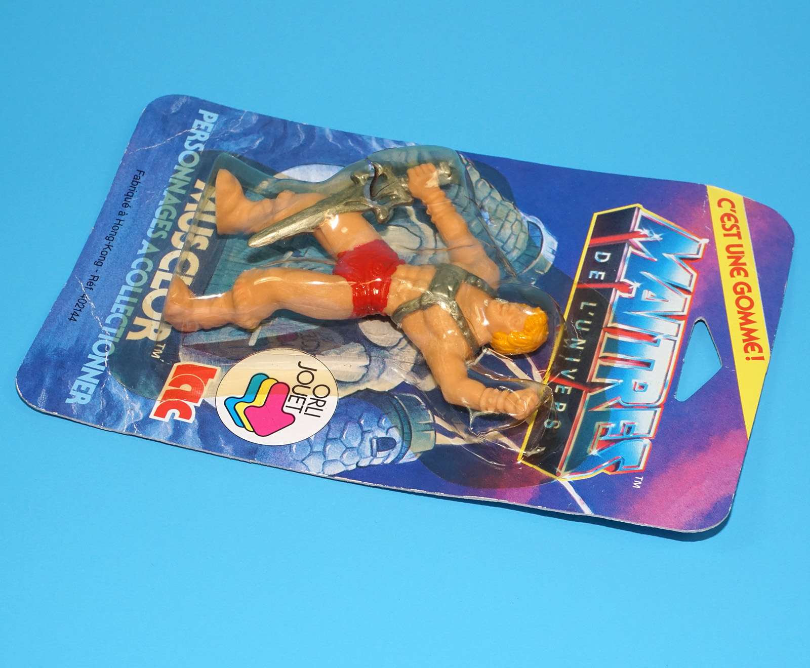 MOTU HE-MAN MASTERS OF THE UNIVERSE GOMME COLLECTIBLE ERASER MUSCLOR HE-MAN MOC MOSC EURO CARD 1984 TAC FRANCE MATTEL READ