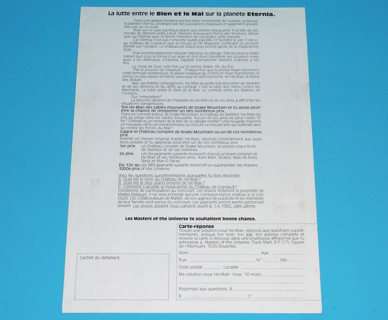 MOTU HE-MAN MASTERS OF THE UNIVERSE ‘SNAKE MOUNTAIN CONTEST’ FORM 1985 BELGIUM