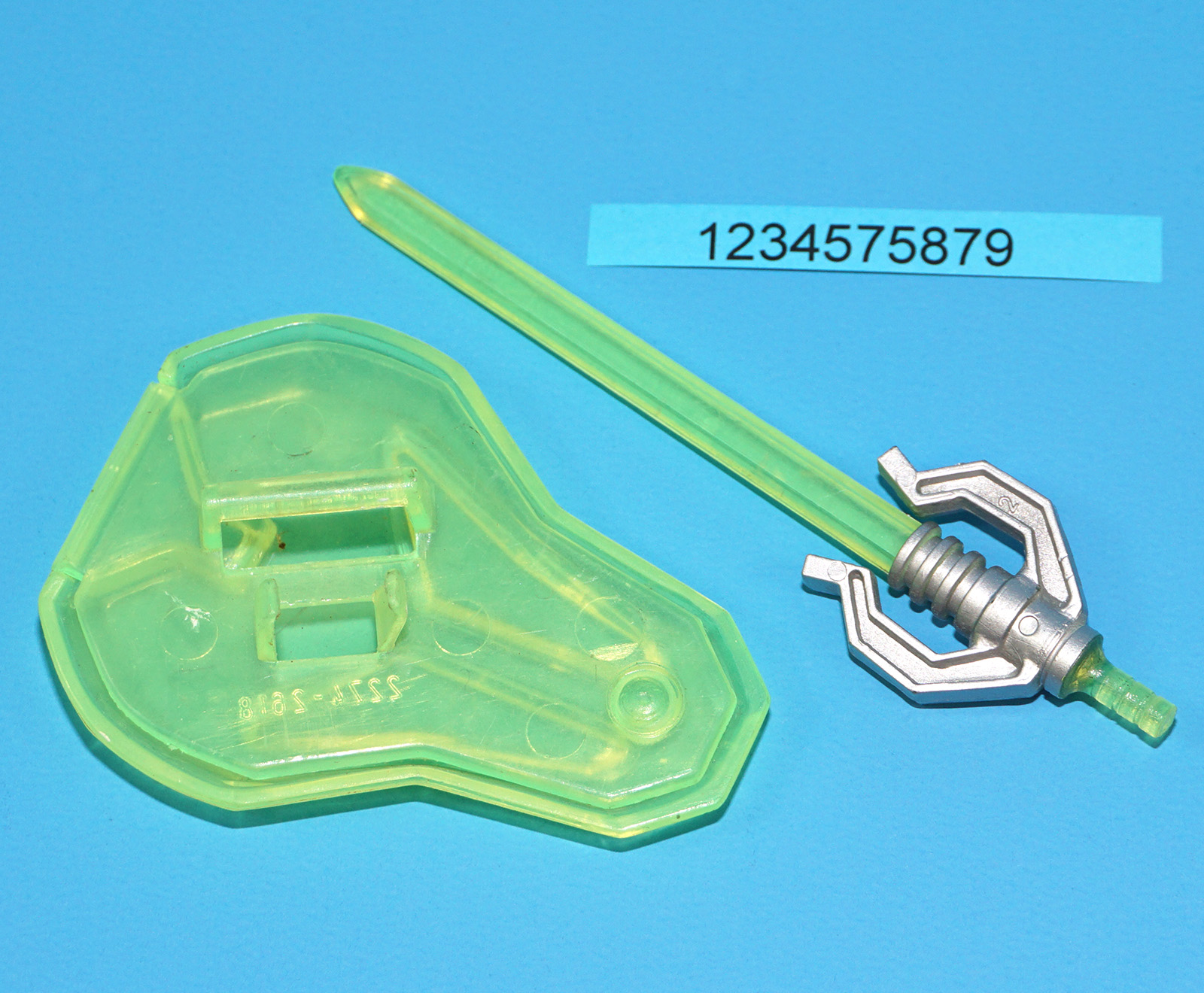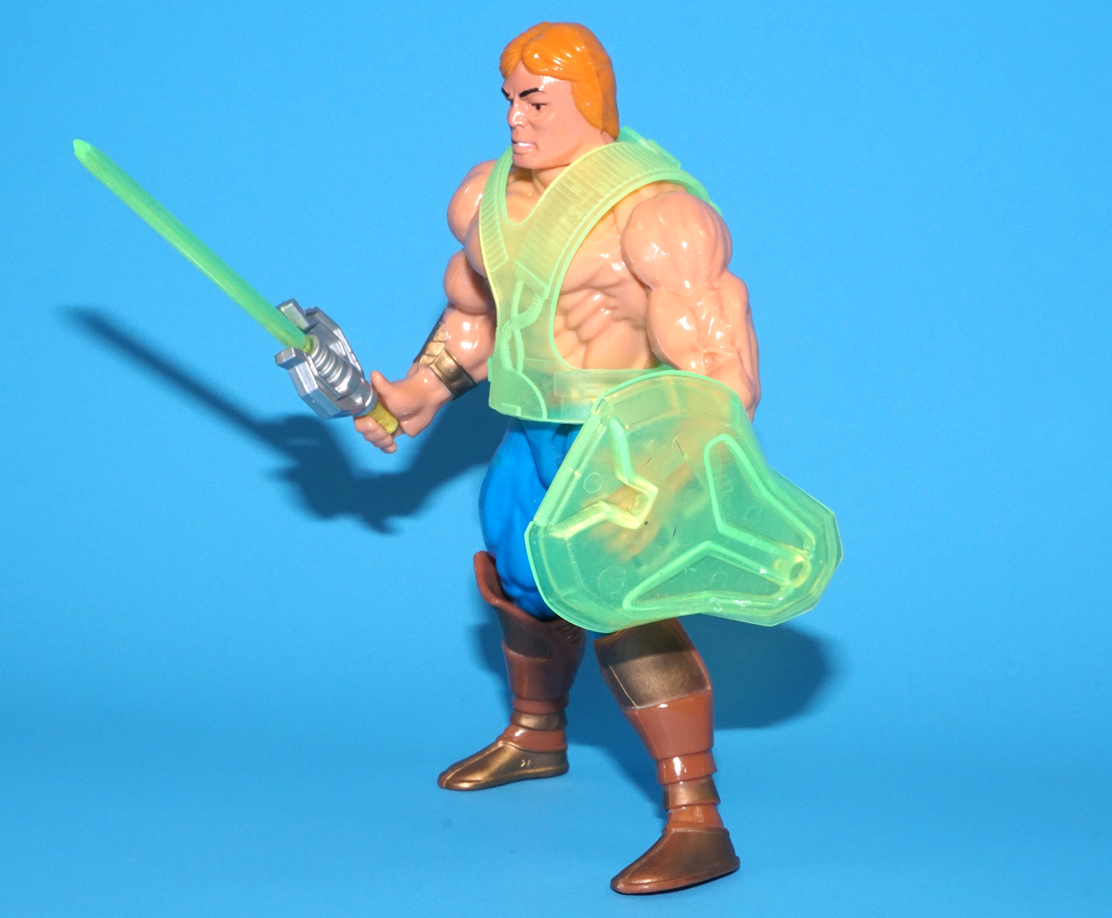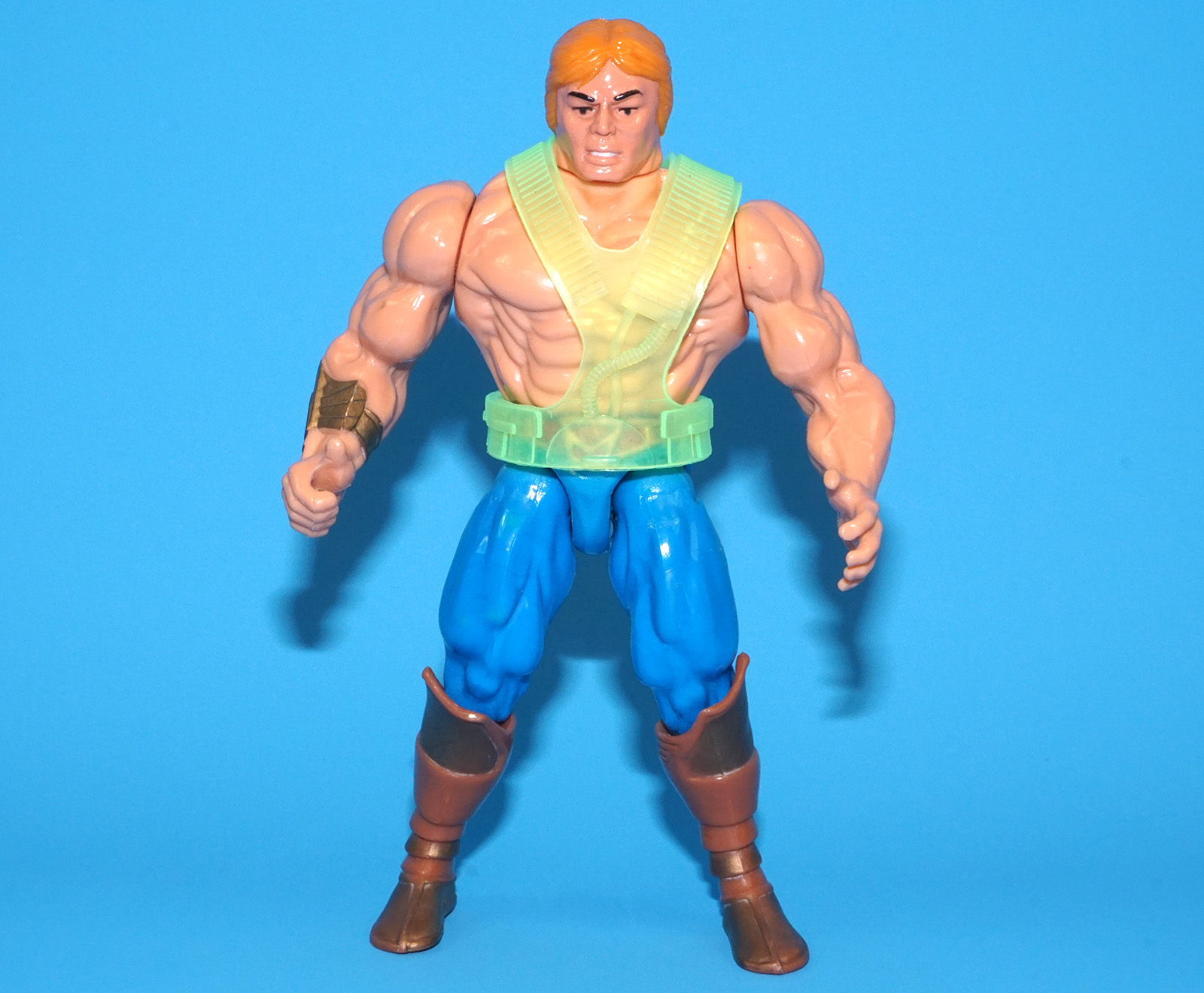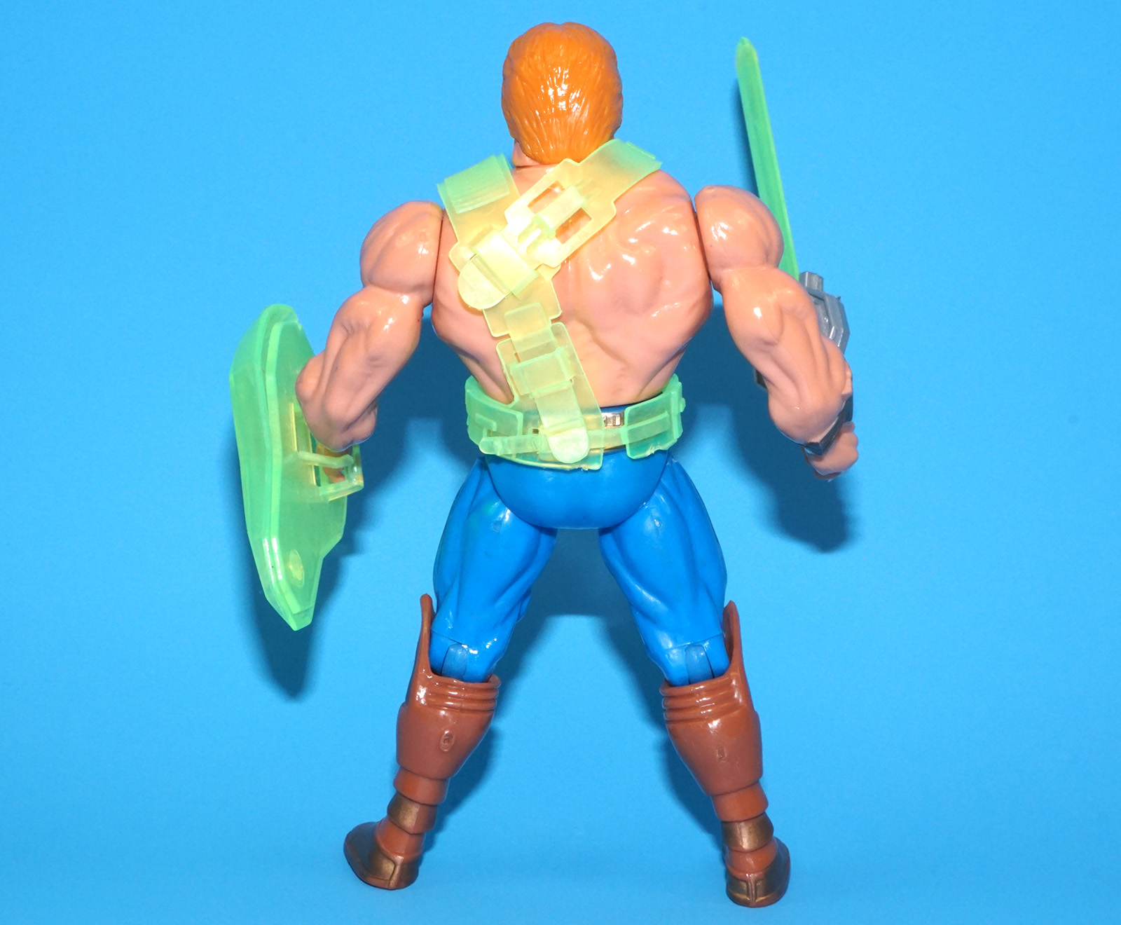 Minor damage to sword (missing small piece of the handle. Standard 1989 He-Man shield. Cracked crotch (bad sonic weld. See pictures for details.