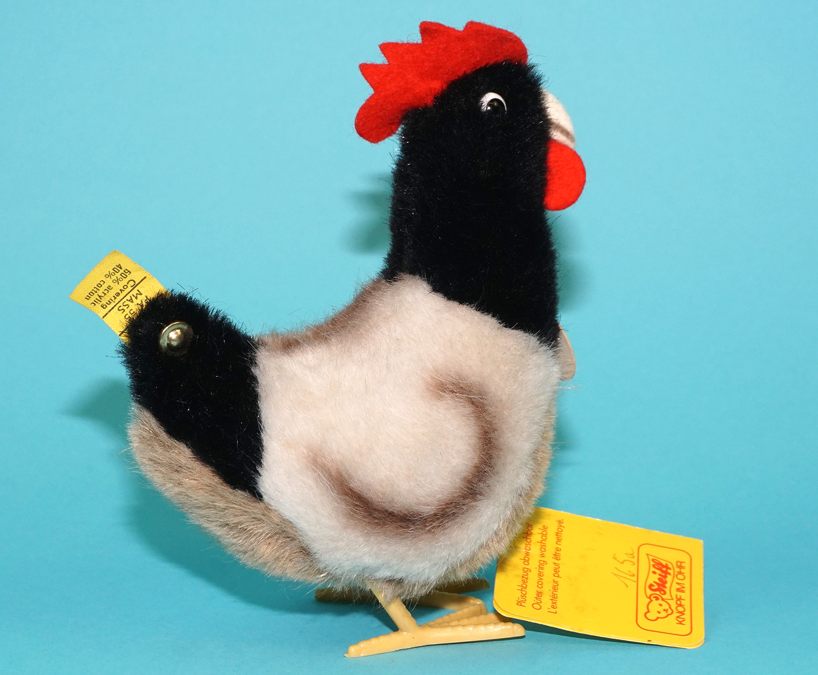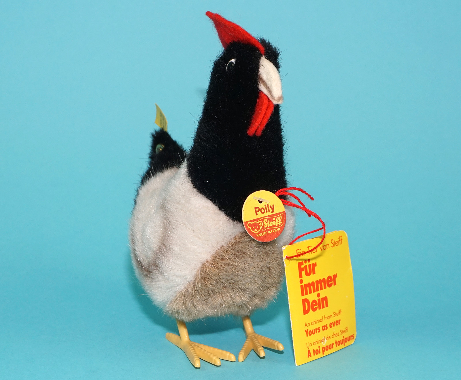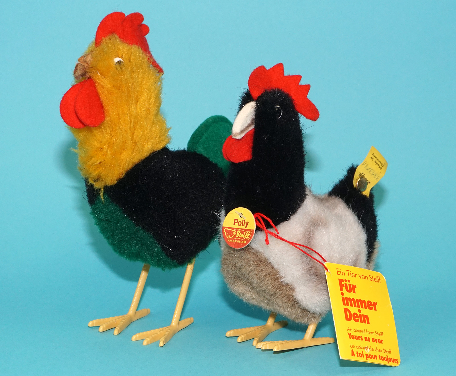 STEIFF PLUSH POULTRY 6″ POLLY CHICKEN HEN 3363 14 & GALLO ROOSTER 1979 GERMANY