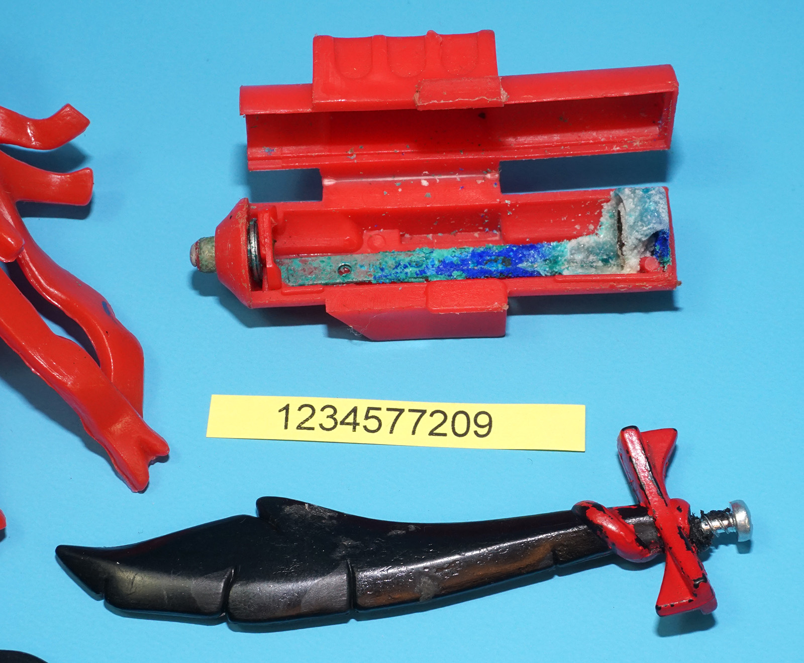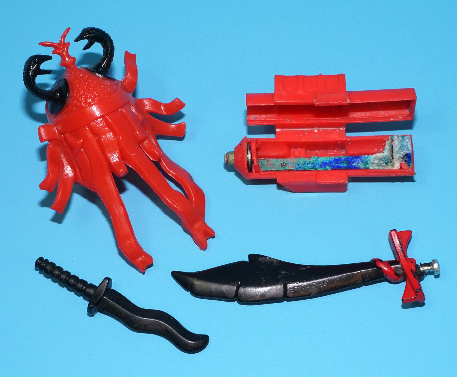 Right arm mechanism works. Left arm and light up eyes do not. Corroded power ring conductor (missing clip). Damaged sword handle. See close ups for details.