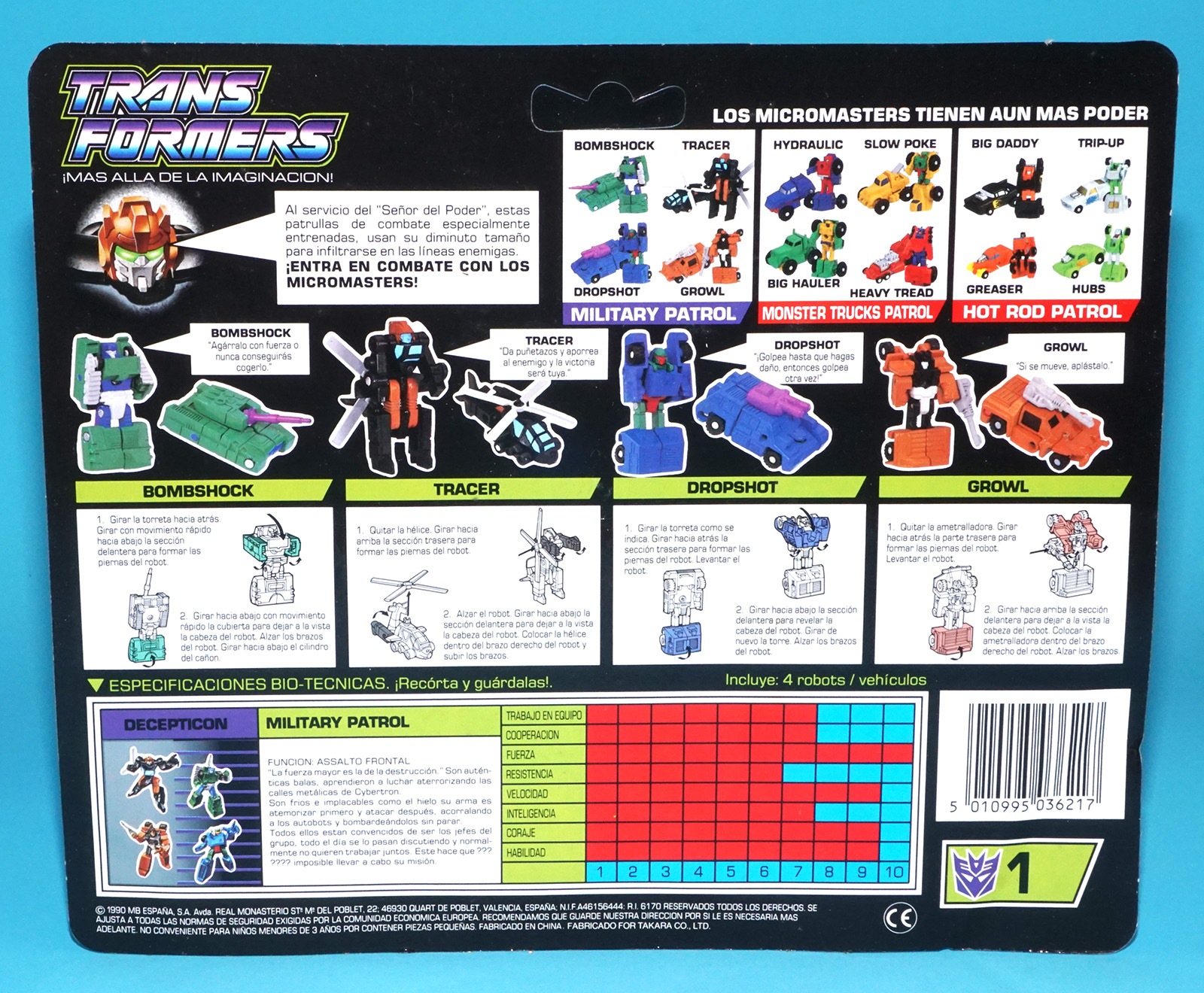 TRANSFORMERS G1 MICROMASTER MILITARY PATROL MOC MOSC EURO SPANISH CARD 1990 HASBRO MB TOYS